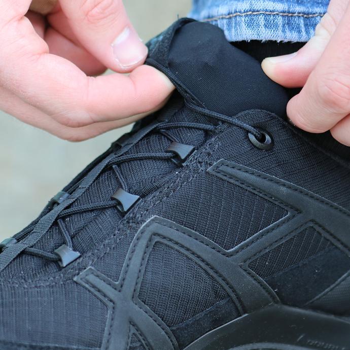 The bungee laces in Black Eagle Athletic 2.1 T Low are made to move as you move. The elastic in the lacing continually adjusts, relieving pressure points, so your feet do not swell. The laces can easily be tucked in the handy, streamlined lace pocket, keeping them out of your way all day long.