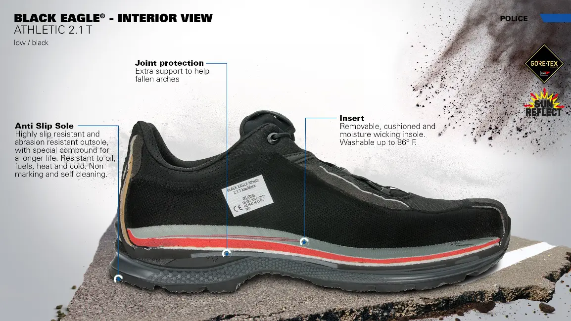 Black Eagle Athletic 2.1 T Low could be the lightest shoes you will ever own. Their lighter weight may make you forget you are even wearing duty shoes. It reduces foot and leg fatigue when you are on the move all day.