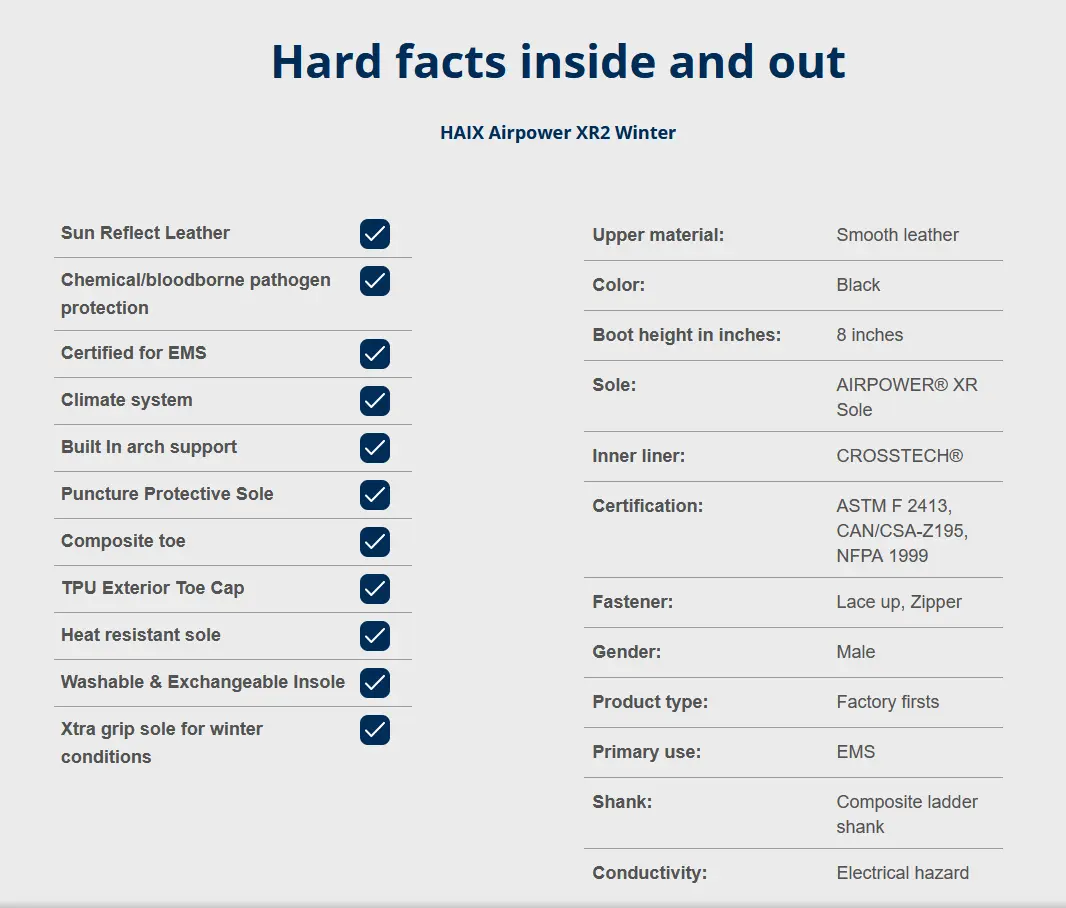 The Airpower® XR2 and Airpower® R2 are certified to NFPA 1999 for emergency medical operations while the Airpower® XR1 is certified to both NFPA 1999 and NFPA 1977 for Wildland Firefighting.The Airpower® XR2 and Airpower R2 are both 8" in height while the Airpower® XR1 is 9" in height. Both the Airpower® XR1 and XR2 are composite toe with non-metallic puncture plates while the Airpower® R2 has a steel toe and steel puncture plate. The Airpower® R2 differs from the other 2 models in that it has a leather toe that is polishable. Since the Airpower® XR2 and XR1 are so similar, the Airpower® XR1 has a red NFPA 1977 label on the left boot.